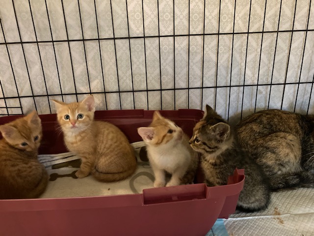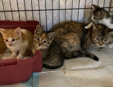 Friendly but scared momma cat Sandy and her adorable babies. Kittens were supposed to already be 8 weeks but are not. They need a little time to get bigger before placing into adoptive homes. They are eating canned and dry on their own. We can loan you a large crate and provide food and litter. You provide love and playtime!