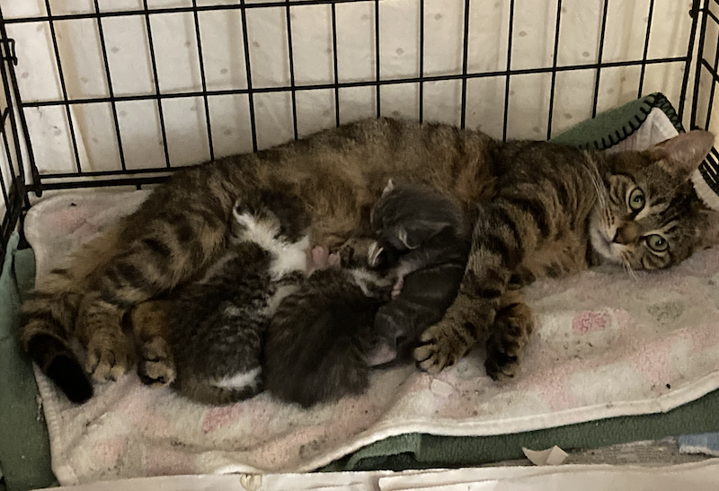 Momma Penny gave us surprise just 3 days after the vet let us know she was pregnant! She has 3 adorable little ones who's eyes have just opened. Penny is a little shy but very sweet and loves to be petted. She is a great momma and everyone is doing well.